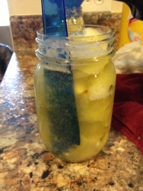 | I have the slices soaking in part lemon juice and part water to prevent browning. |