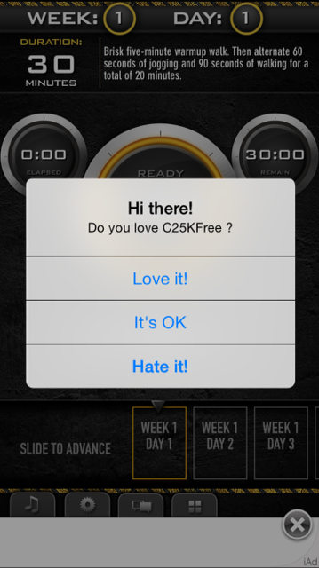 Okay, I’m officially signed up. I have no choice BUT to get out there and start running. I go to my C25K app to get started…and this. Not the time to be asking for my opinion on something I am really not wanting to have any part of at the moment.