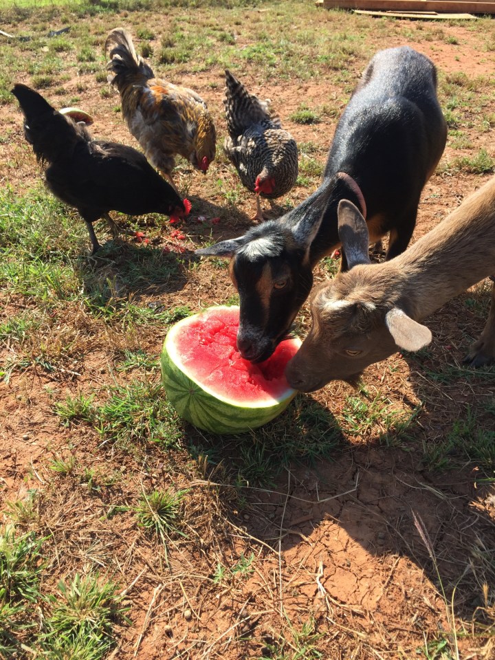 I recently found out that my children are not the only ones who love watermelon, apparently, so do my chickens and goats.