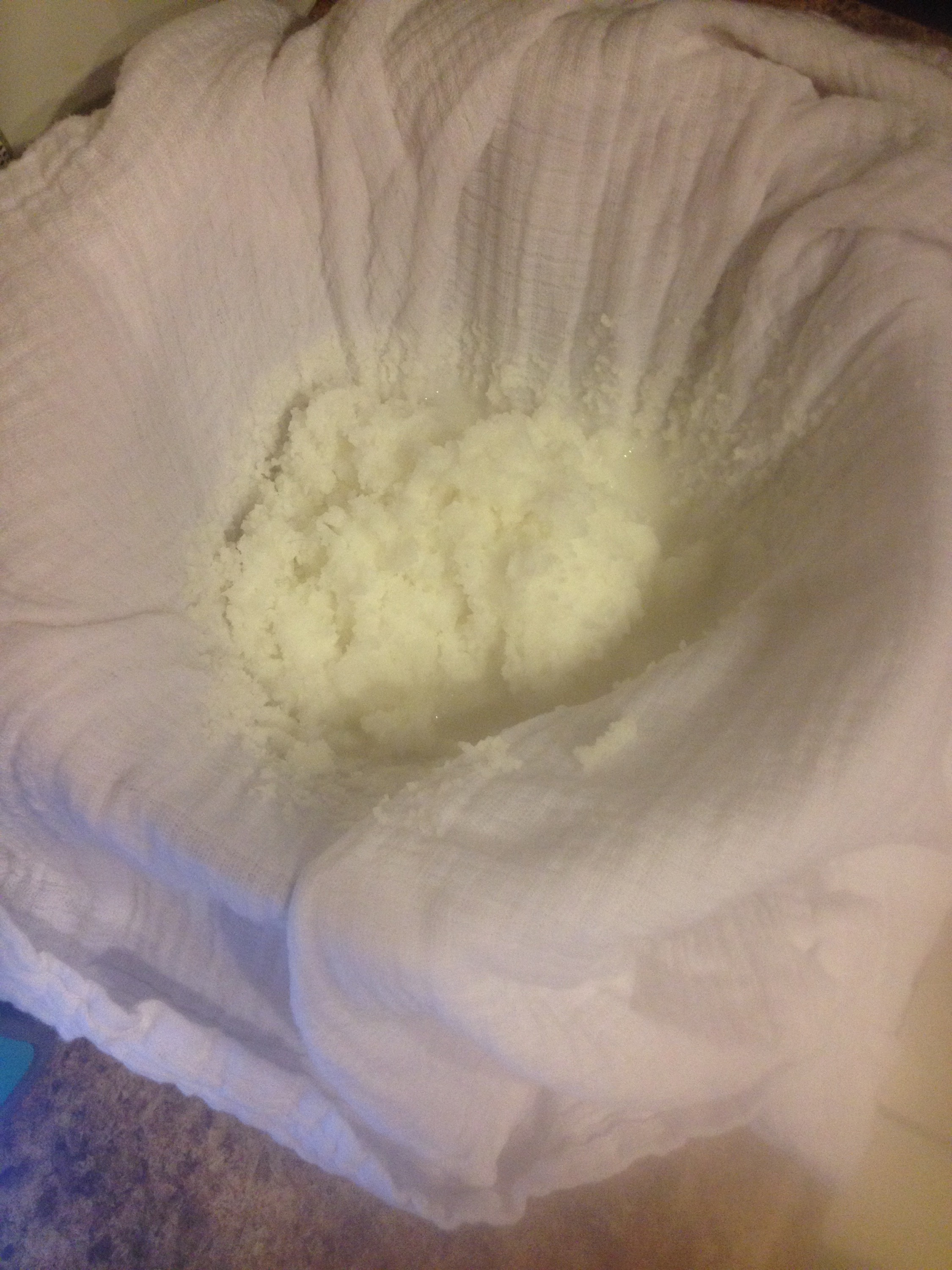 3. Make sure you have all materials needed so you don’t have to creep into your napping daughter’s room and swipe a (clean) lovely Aden & Anais blanket to use as a cheesecloth.