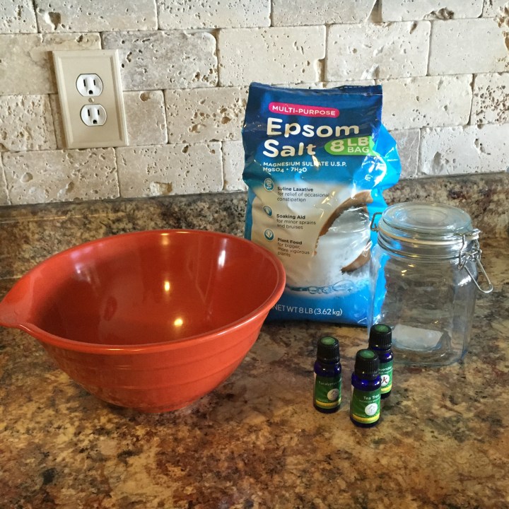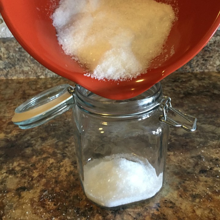 Today I decided to mix up a quick batch of scented salts for the bath. With school starting back up and all the extra activities that go along with it, lots of germs will be finding their way back into my home…and me, always on an anti-germ mission, decided it would be good to have this jar of bath time salts ready to go.